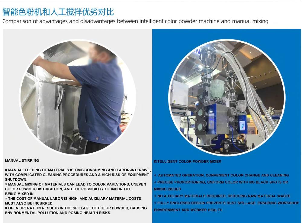 100KG/J"Campuran Serbuk Warna Pintar" boleh disepadukan dengan lancar dengan sistem suapan terpusat, sistem penghantaran pusat dan sistem pengendalian bahan automatik. Pengadun Warna Plastik dilengkapi dengan penderia penimbang ketepatan tinggi, yang memastikan keseragaman proses pencampuran dan konsistensi warna, dan menyokong pembahagian automatik serbuk dan bahan tambahan berbilang komponen.